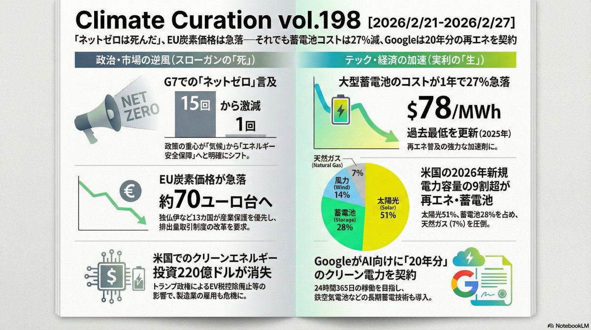 Vol.198「ネットゼロは死んだ」、EU炭素価格は急落――それでも蓄電池コストは27%減、Googleは20年分の再エネを契約