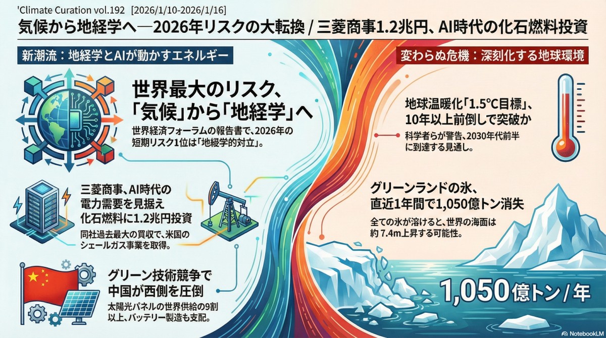Vol.192 気候から地経学へ—2026年リスクの大転換 / 三菱商事1.2兆円、AI時代の化石燃料投資