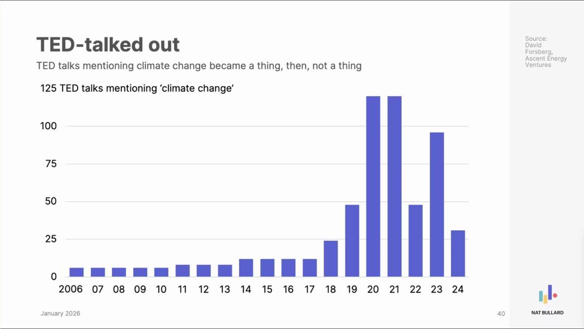 エネルギーアナリストNat Bullard氏の恒例の年次プレゼンテーション(全200スライド)が公開されました。2025年は観測史上2番目に暑い年タイ、石炭消費も過去最高を記録する一方、中国の化石燃料排出量は18ヶ月間横ばい状態にあります。AIデータセンターの急増により米国電力需要予測は大幅上方修正され、170以上のガス発電所が計画中。興味深いのは、TEDトークでの「気候変動」言及数が2020-21年のピーク(年間110回以上)から2024年には約30回へと激減していること。気候変動への社会的関心の変化を示唆しています。EV販売は北米で減少も他地域では増加、中国は再生可能エネルギー投資で世界の半分以上を占めるなど、脱炭素化の複雑な現状が浮き彫りになっています。