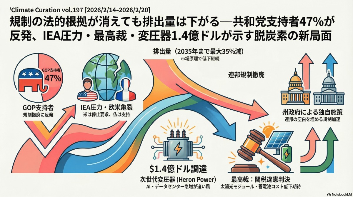 Vol.197:規制の法的根拠が消えても排出量は下がる―共和党支持者47%が反発、IEA圧力・最高裁・変圧器企業1.4億ドル調達が示す脱炭素の新局面